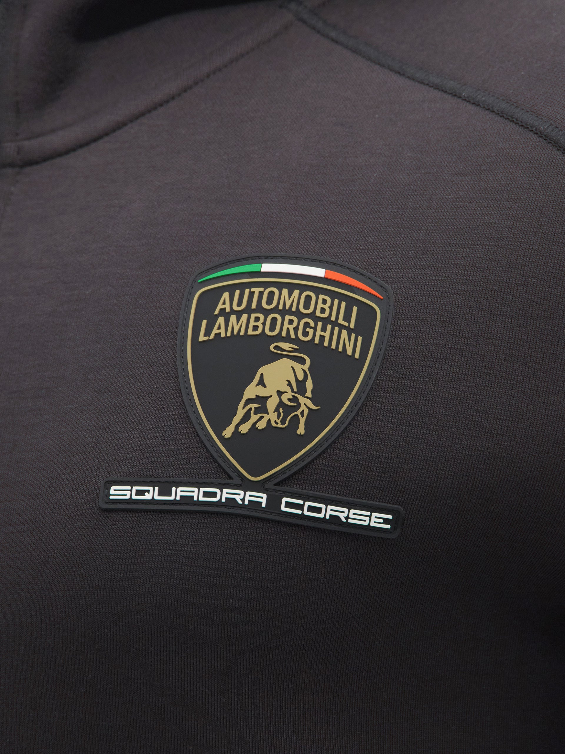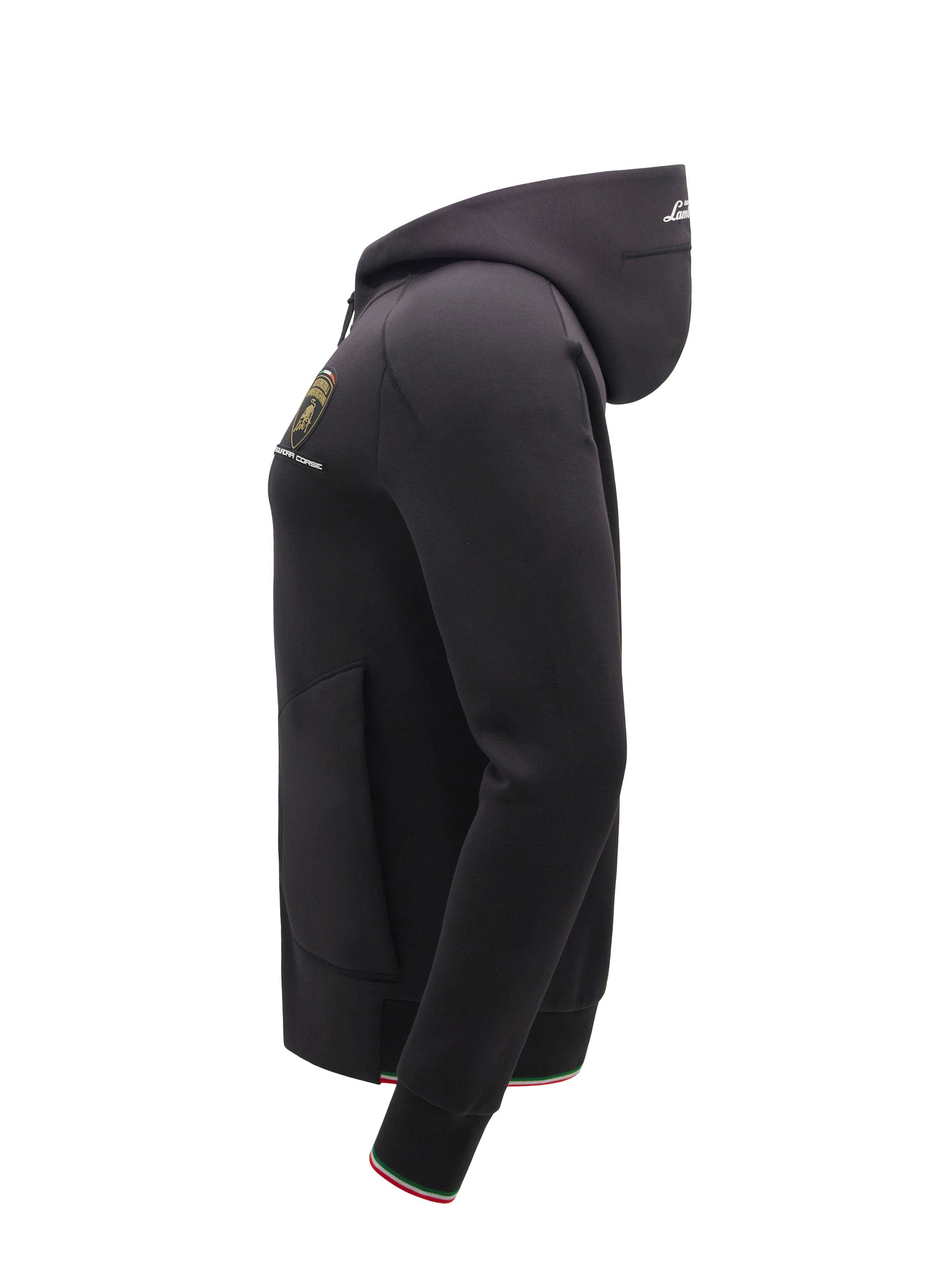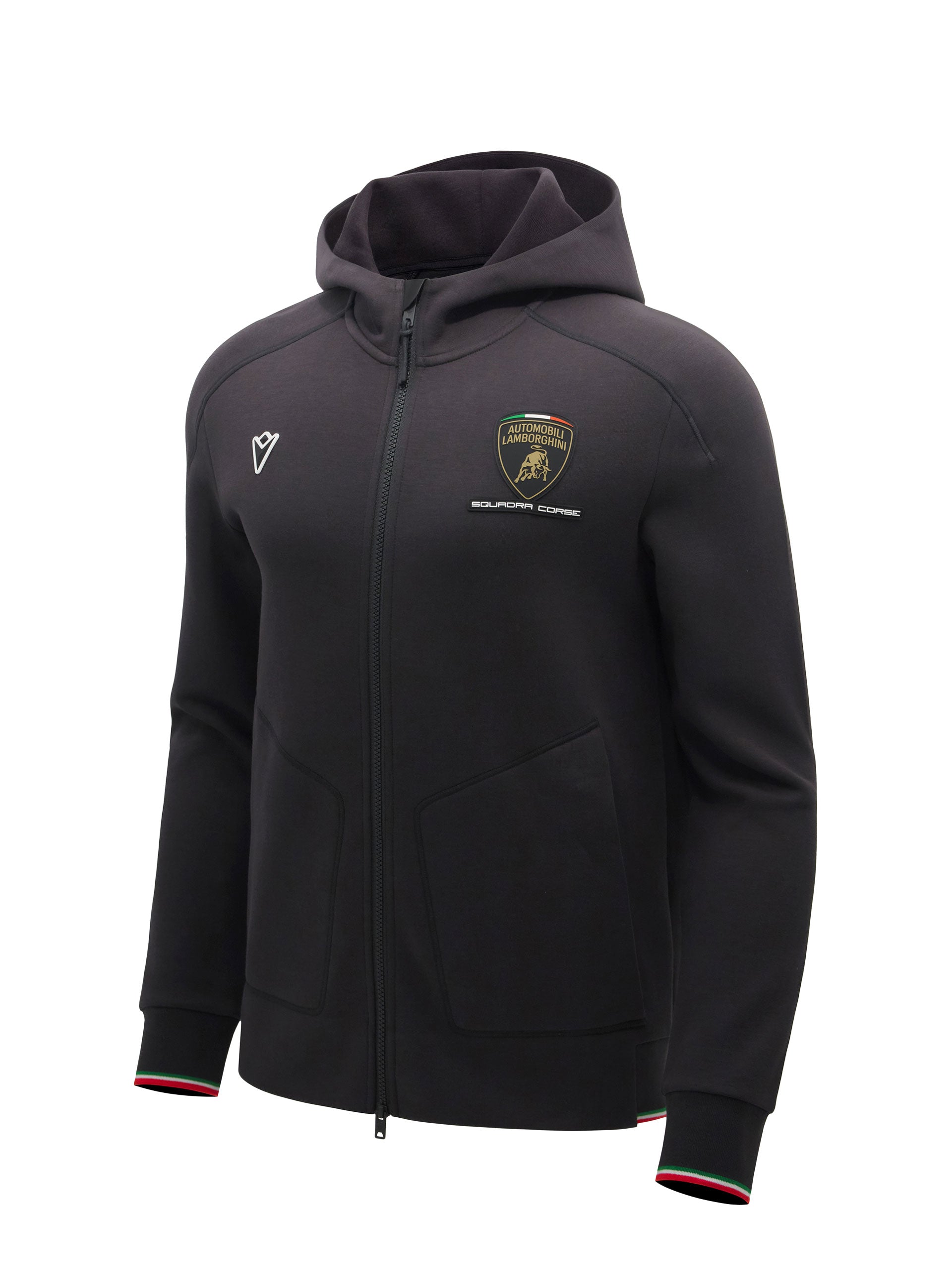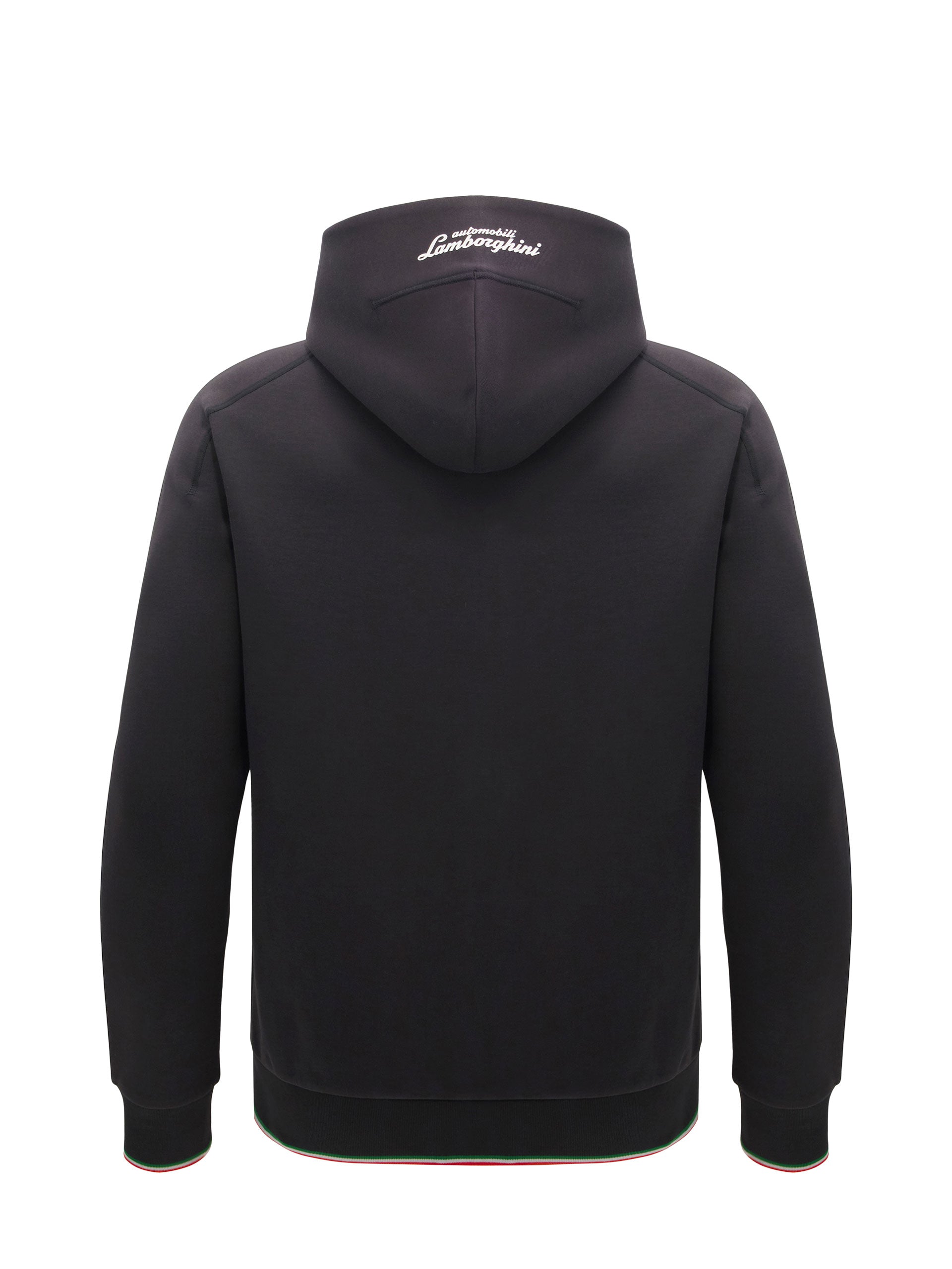 Der schwarze, dreifarbige Full-Zip-Hoodie für Herren besteht aus Interlock-Gewebe und bietet Komfort und Leichtigkeit – ideal für den täglichen Gebrauch. Rippbündchen an Saum und Ärmeln sorgen für eine optimale Passform. Ein vielseitiges Kleidungsstück, bis ins kleinste Detail gepflegt, perfekt zur Ergänzung dynamischer Outfits mit markantem Stil. Das Automobili Lamborghini Squadra Corse Logo ist auf der linken Vorderseite angebracht.