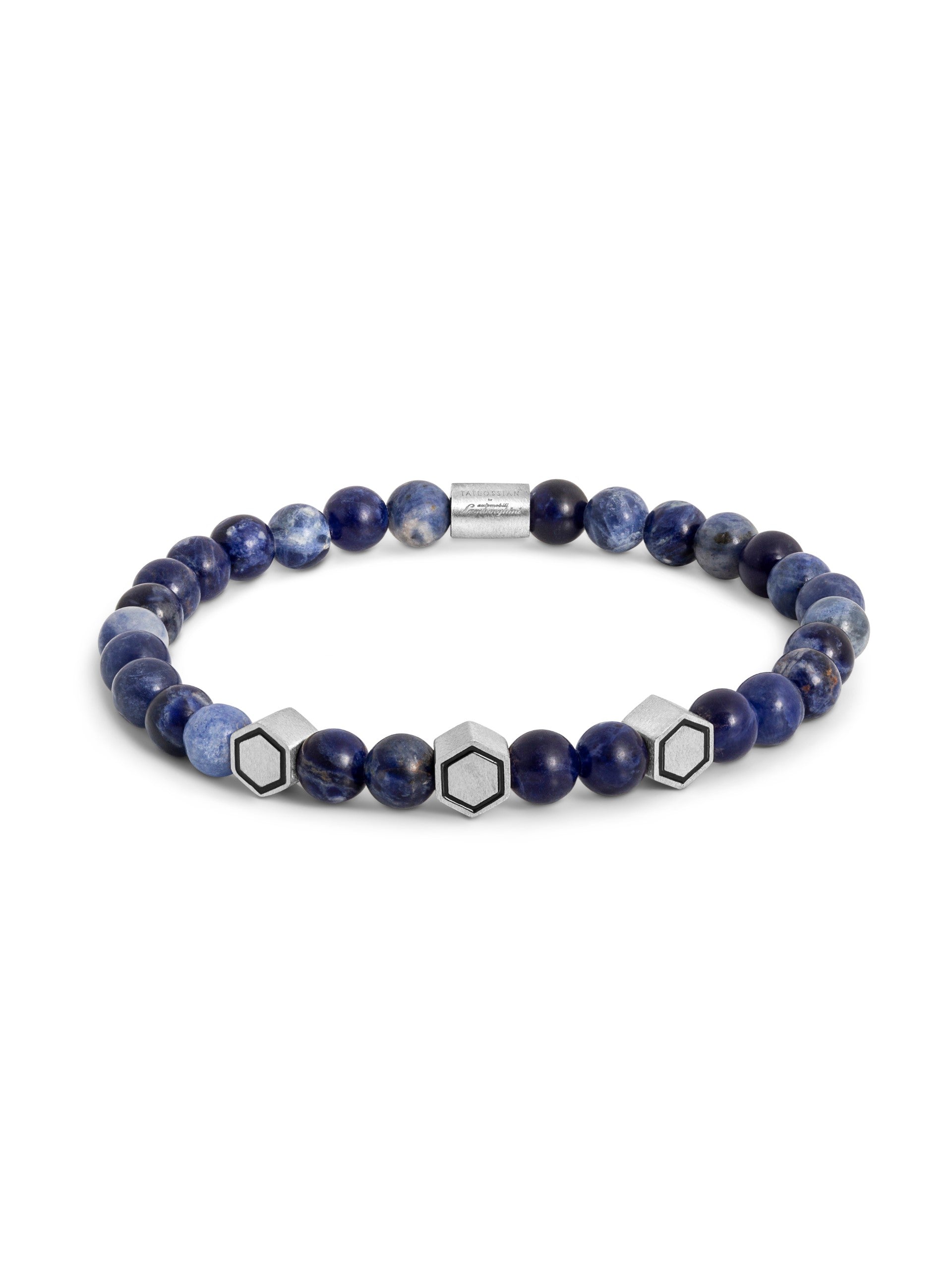 Schlanke Geometrie trifft auf natürliche Energie in diesem Perlenarmband aus 6 mm großen runden Halbedelsteinen. Hexagonale Perlen aus gebürstetem, rhodiniertem Sterlingsilber mit abgerundeten Ecken werden entweder mit poliertem schwarzen Achat oder tiefblauem Sodalith kombiniert. Dieses ausdrucksstarke und doch dezente Armband steht ganz im Zeichen des Spirit von Automobili Lamborghini und überzeugt als stylisches Accessoire mit spannender Haptik. Erhältlich in den Größen Medium (17,5 cm) und Large (19 cm) für eine perfekte Passform.