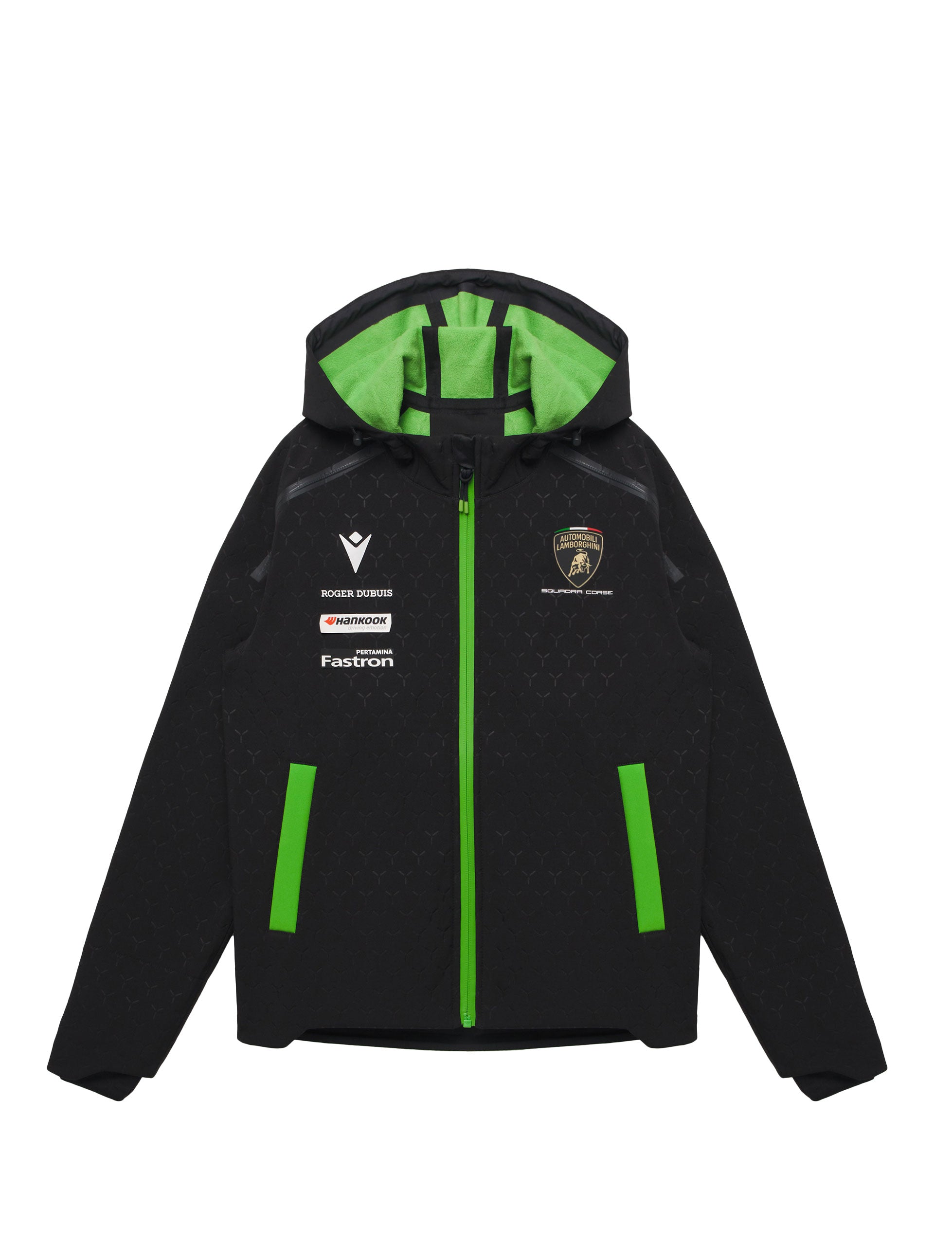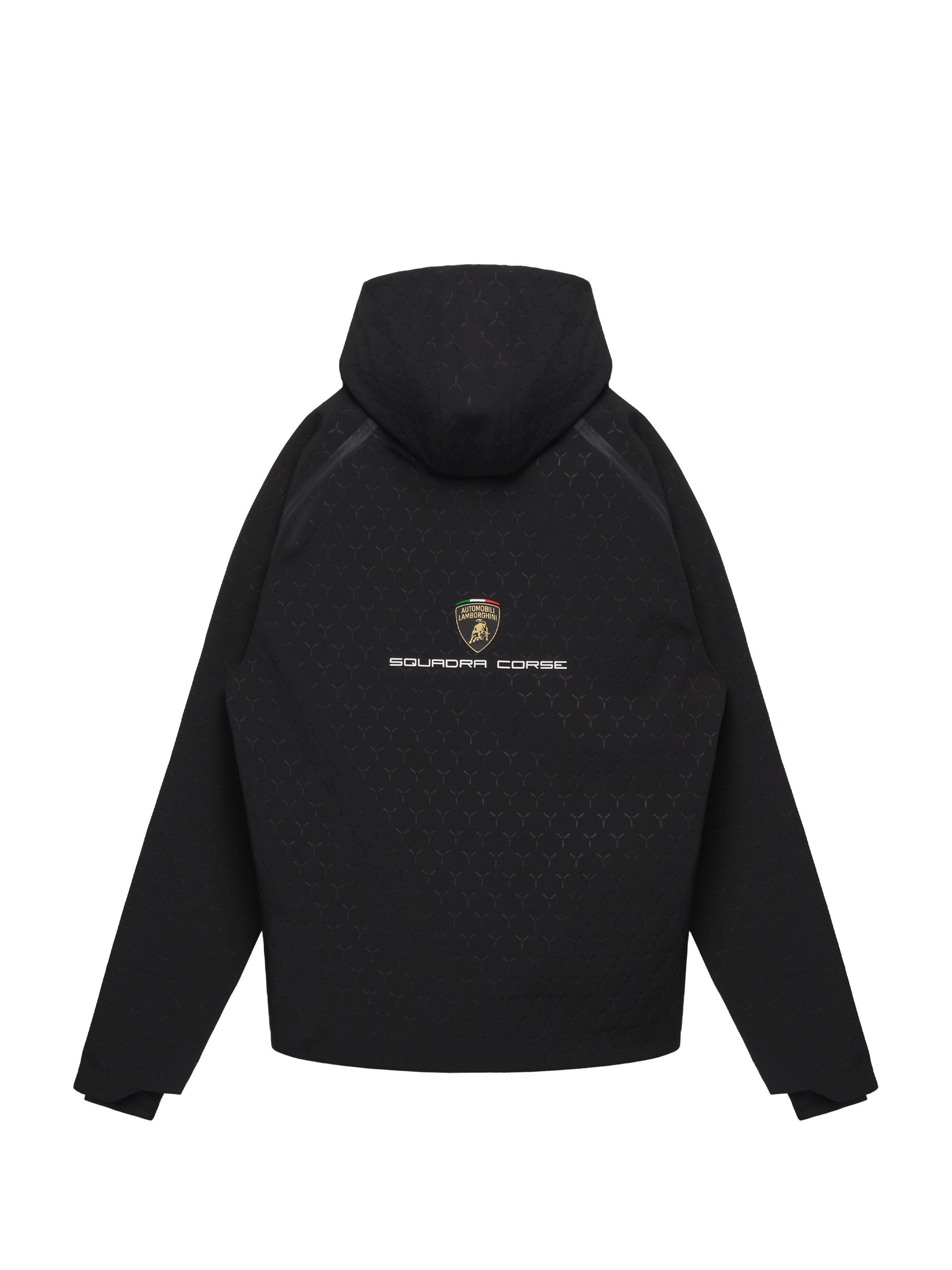 Made in Softshell Waterproof fabric, resistant to water. Characterized by an embossed weave, it features a practical hood with an elastic drawstring and two comfortable side zip pockets. The Automobili Lamborghini Squadra Corse logo is applied on the left front. Further embellished by the colors and the official sponsors of the Racing Team.