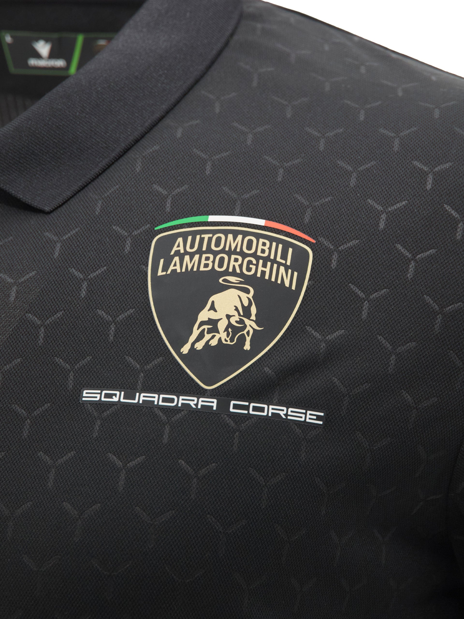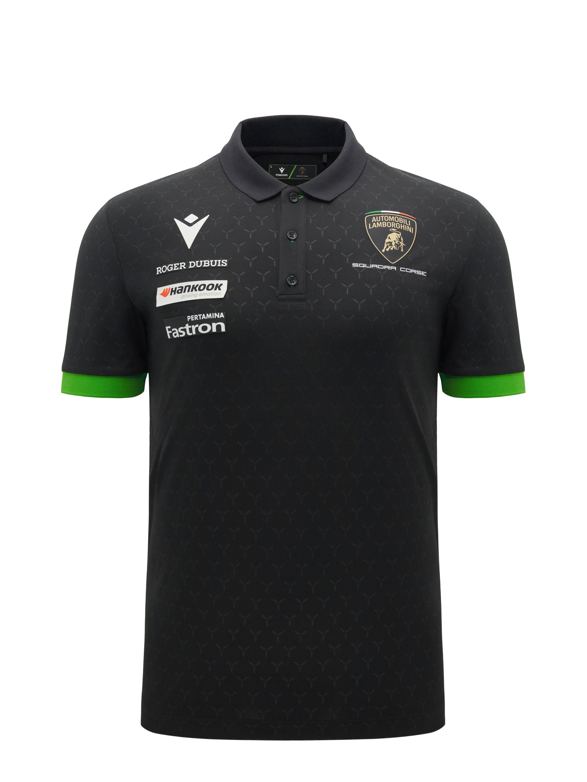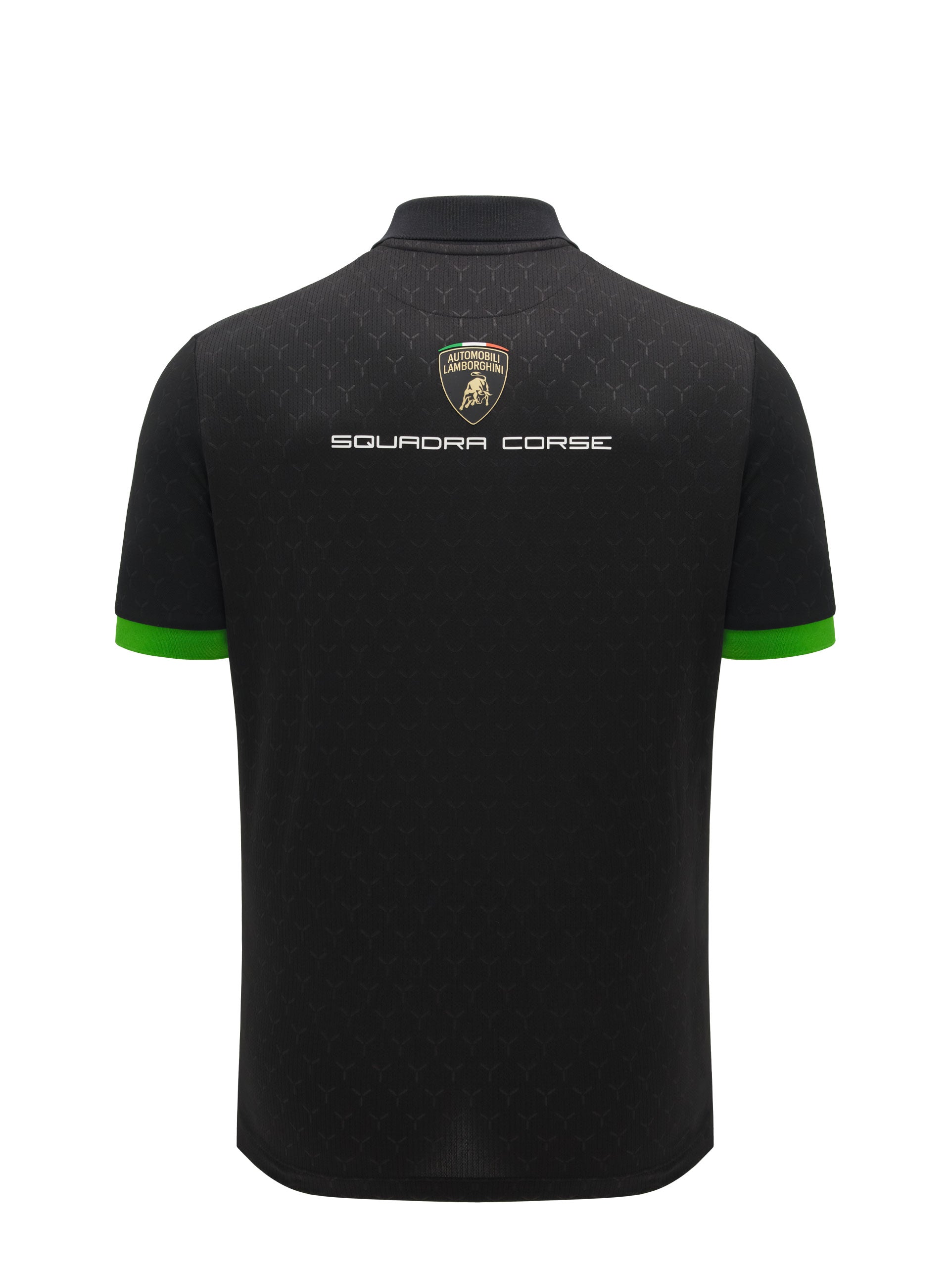 The men’s black polo features an embossed texture that enhances the garment’s design with a distinctive, sporty look. Ribbed details on the collar and sleeves ensure comfort and a well-finished fit. The Automobili Lamborghini Squadra Corse logo is applied on the left front. Further enhanced by the official Racing Team colours and sponsors.