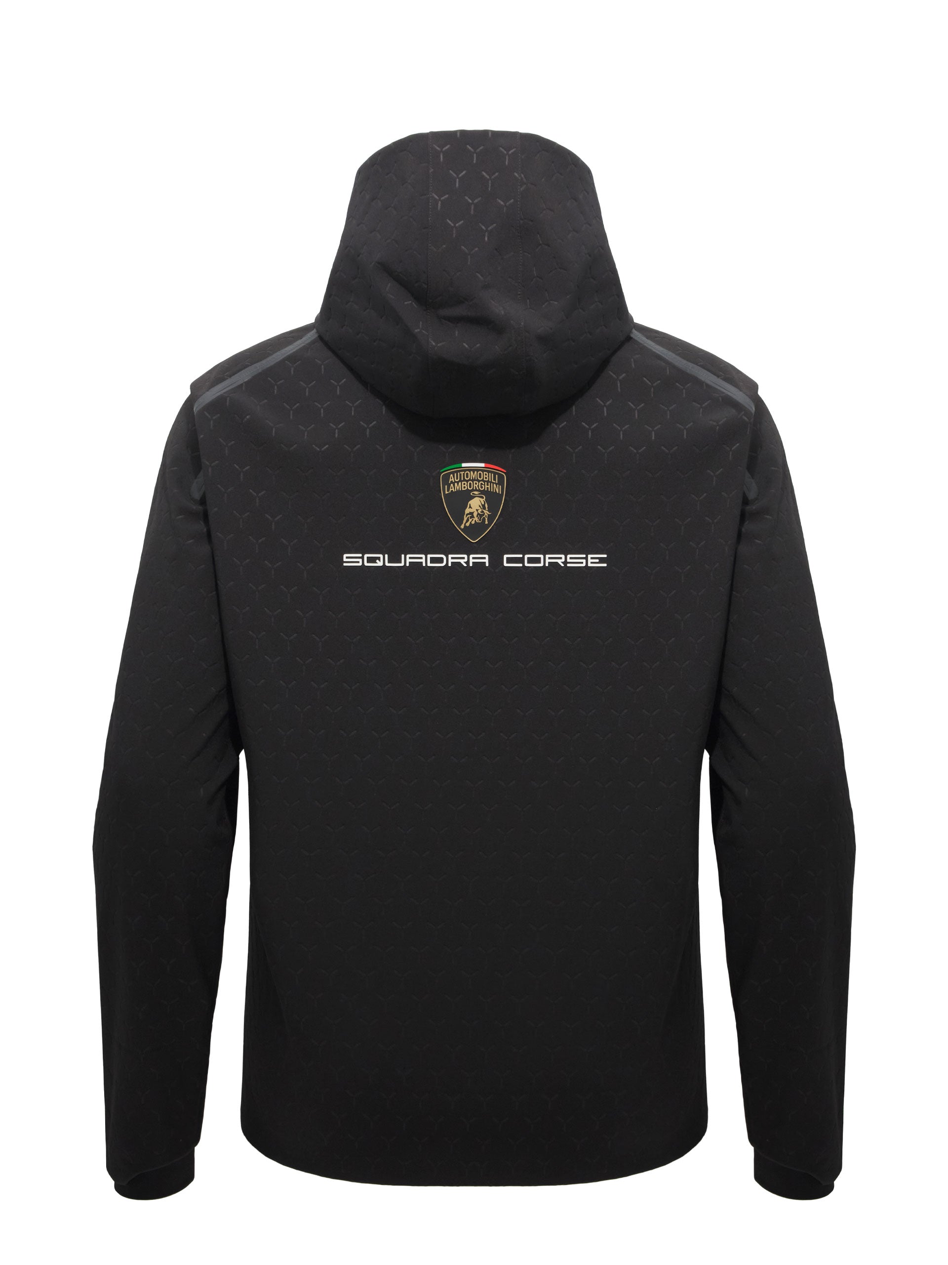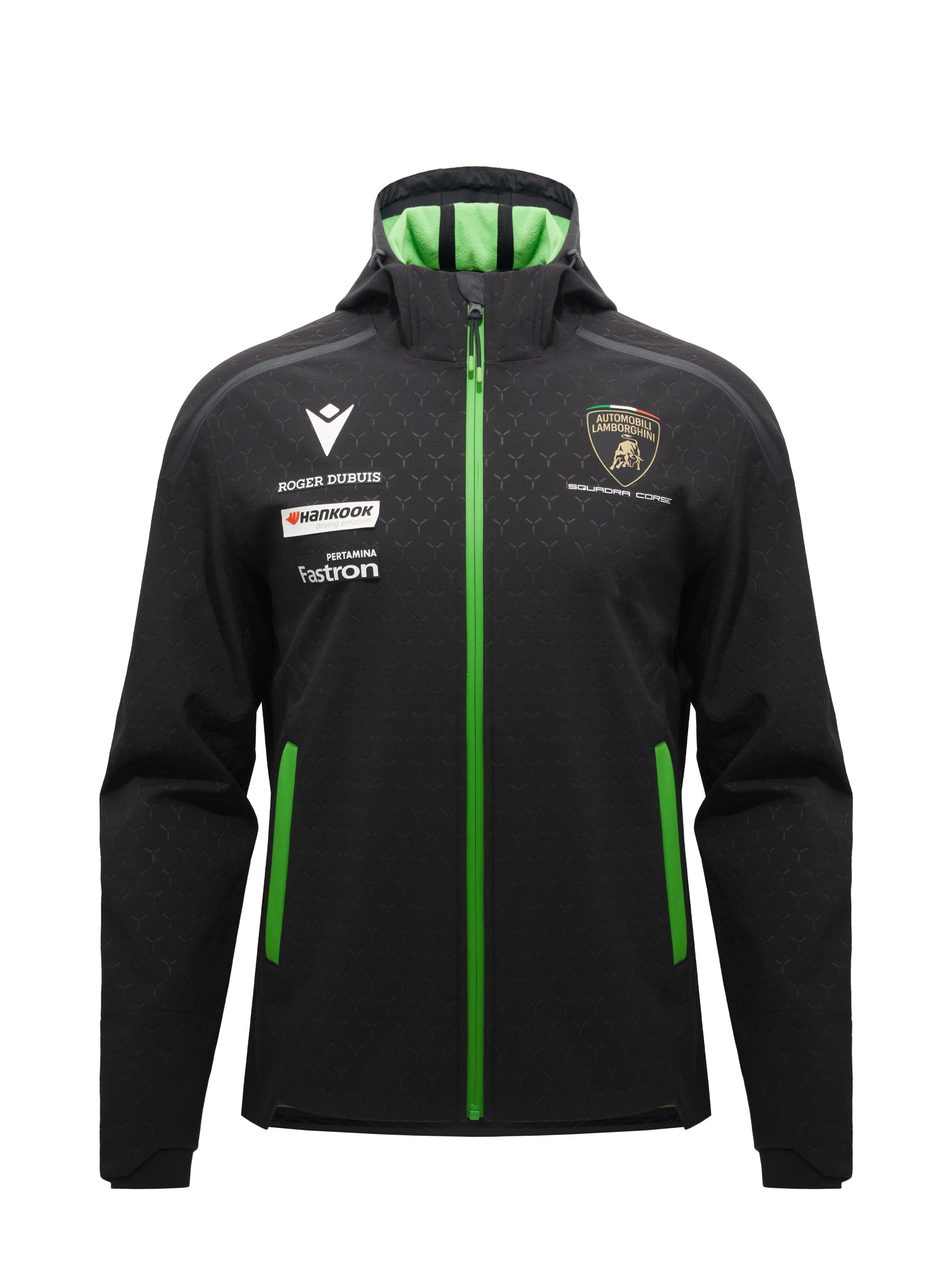 Made in Softshell Waterproof fabric, resistant to water. Characterized by an embossed weave, it features a practical hood with an elastic drawstring and two comfortable side zip pockets. The Automobili Lamborghini Squadra Corse logo is applied on the left front. Further embellished by the colors and the official sponsors of the Racing Team.