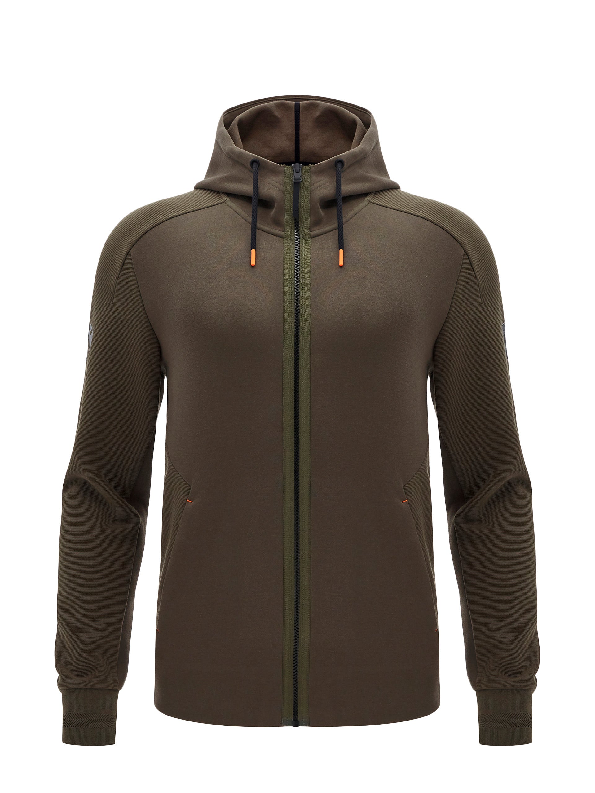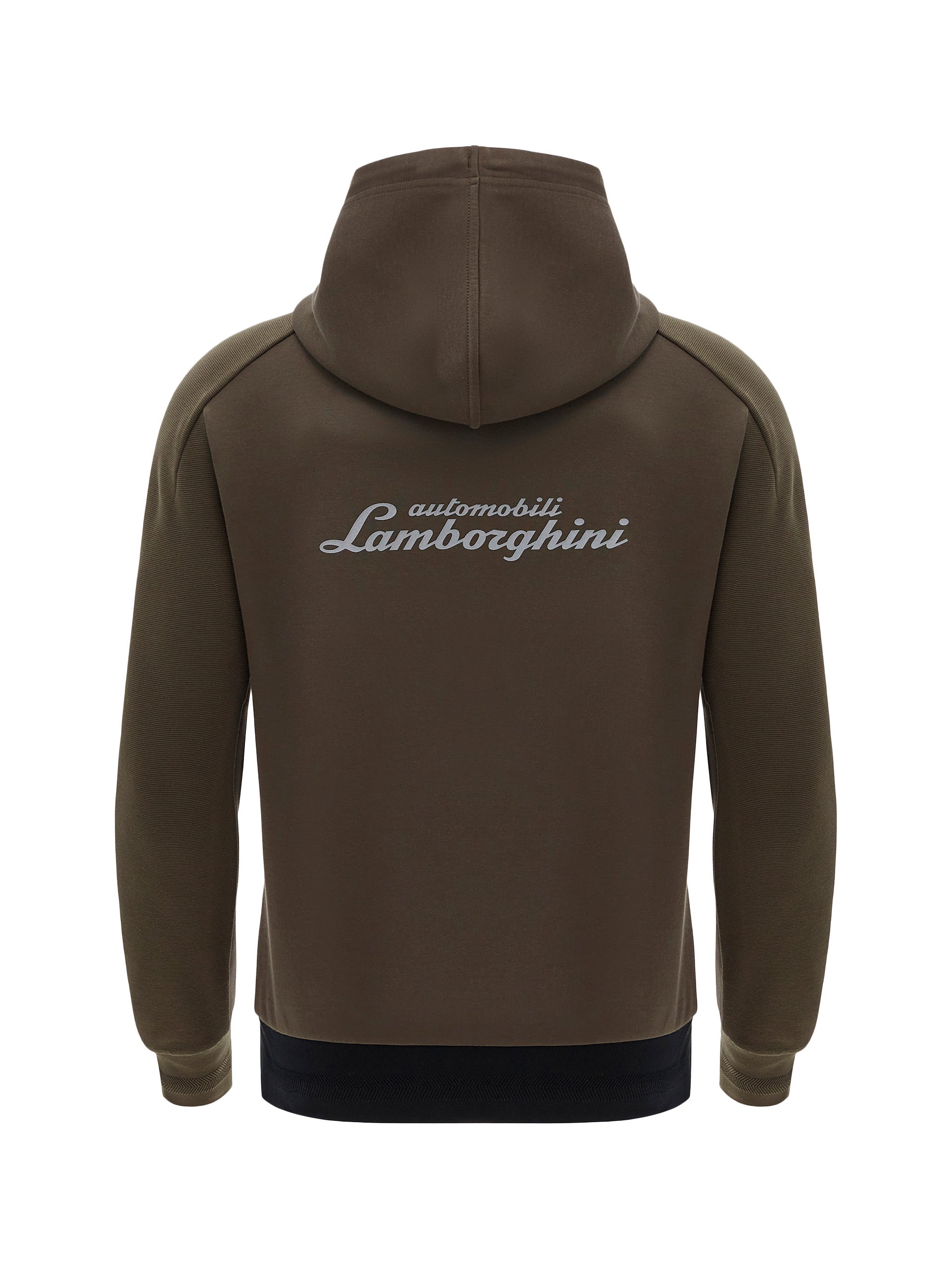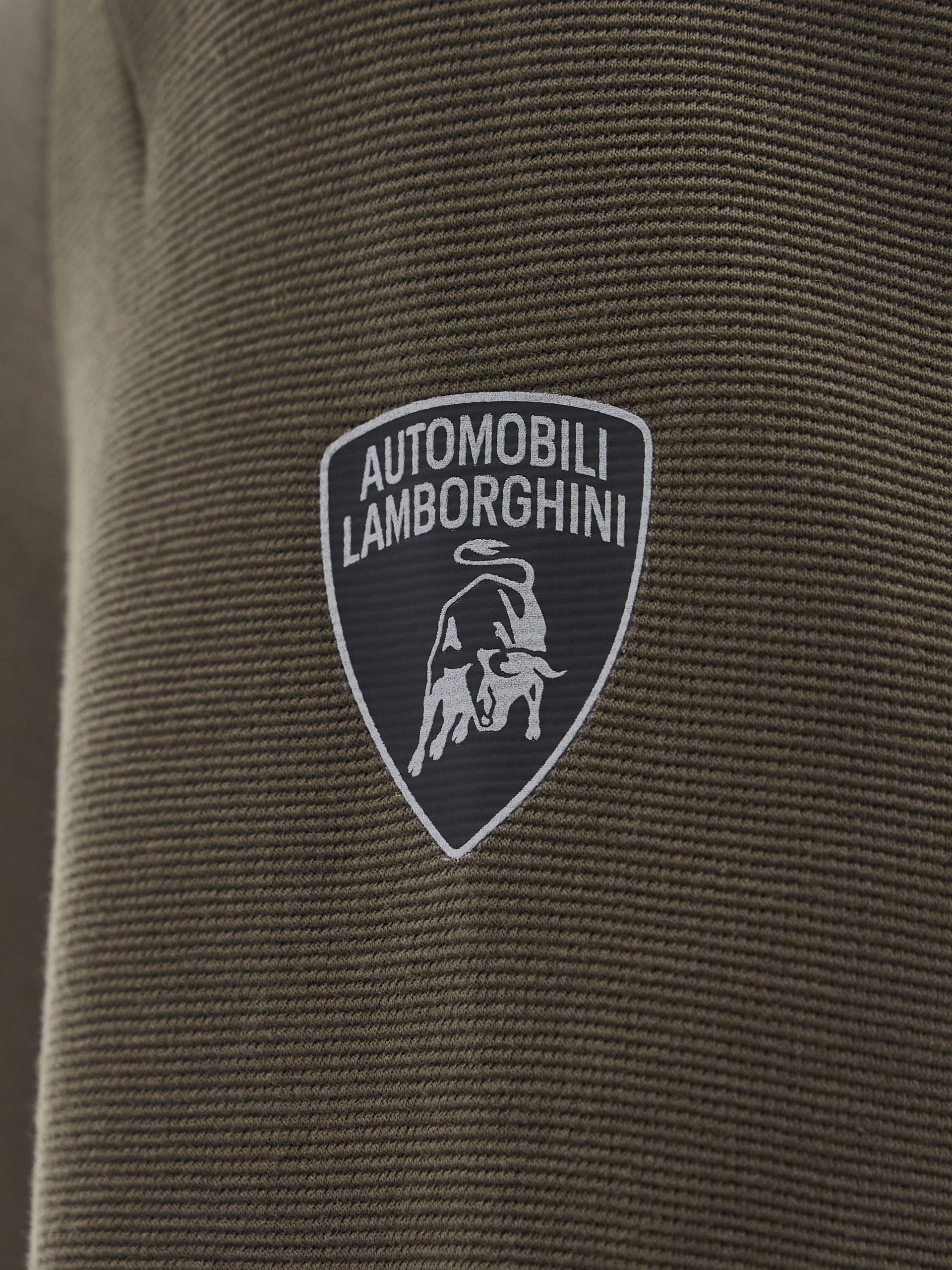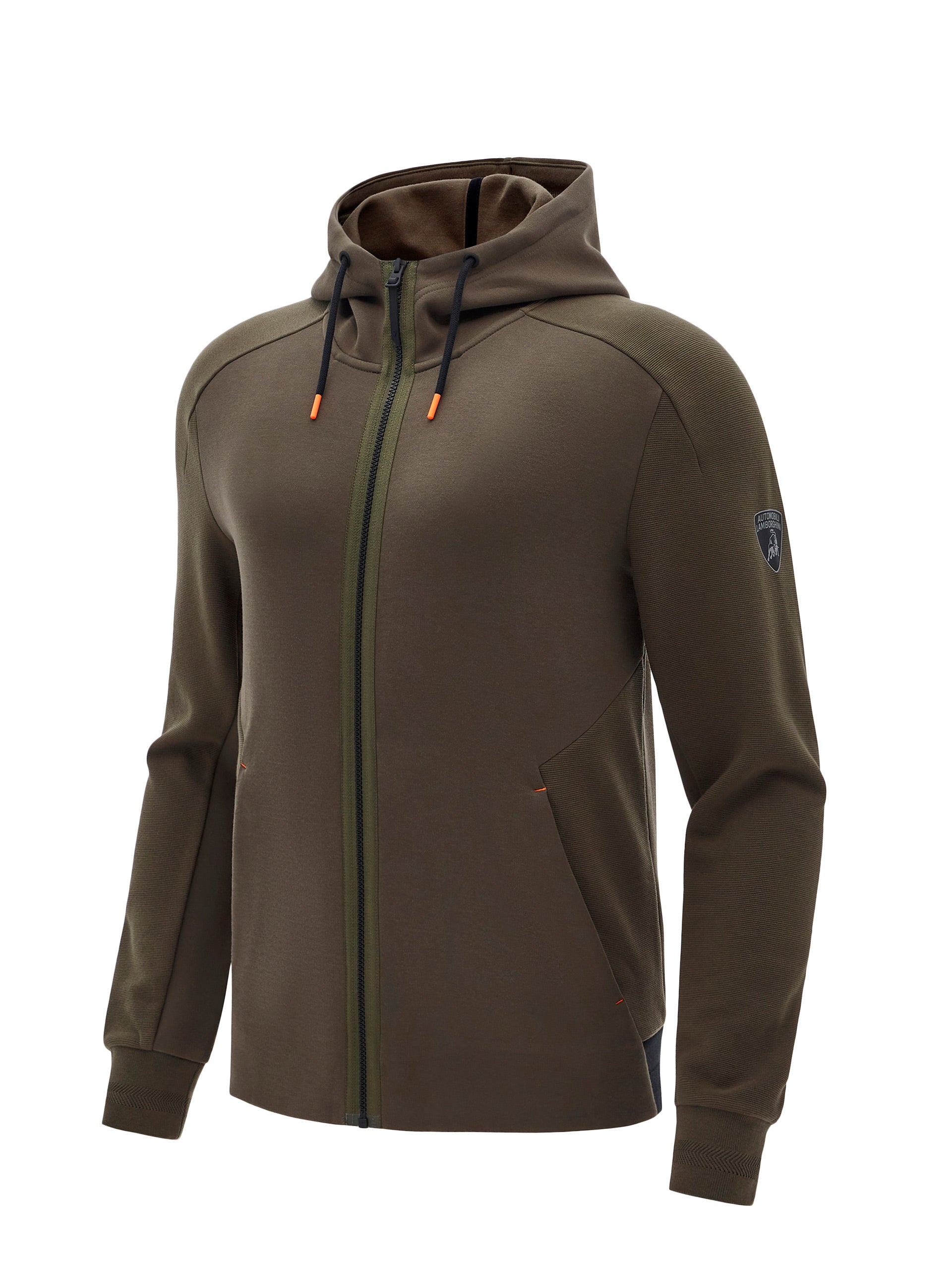 The men's full-zip sweatshirt features a comfortable and lightweight fabric, with jacquard ribbed details that ensure excellent fit and add a touch of class with their sophisticated texture. The striped fabric inserts enhance the structure of the garment, playing with lines and adding visual dynamism. The two-tone drawstring catches the eye, conveying novelty and originality. It's the versatile piece that is indispensable for completing your outfits. The Automobili Lamborghini logo is positioned on the left arm.