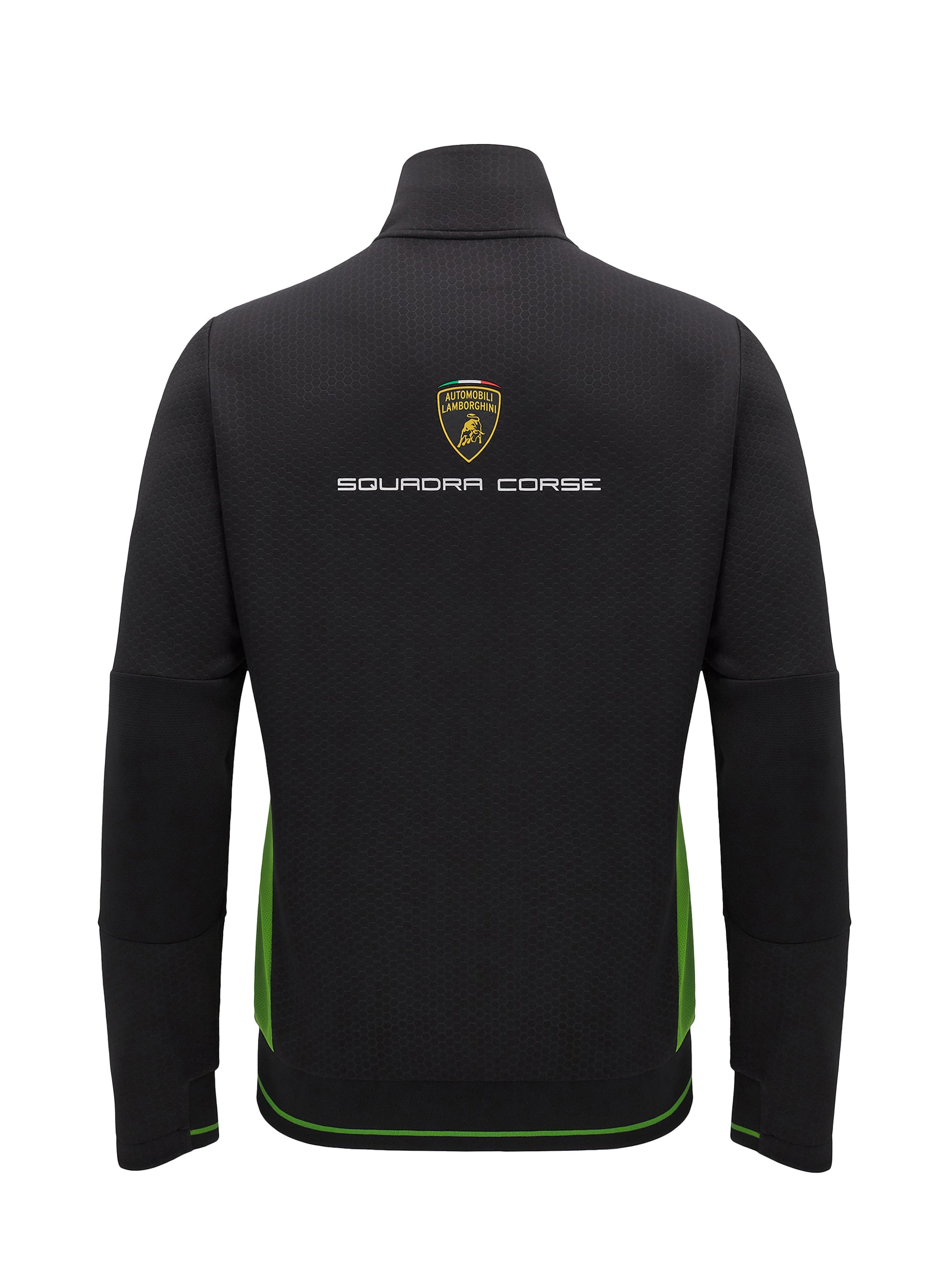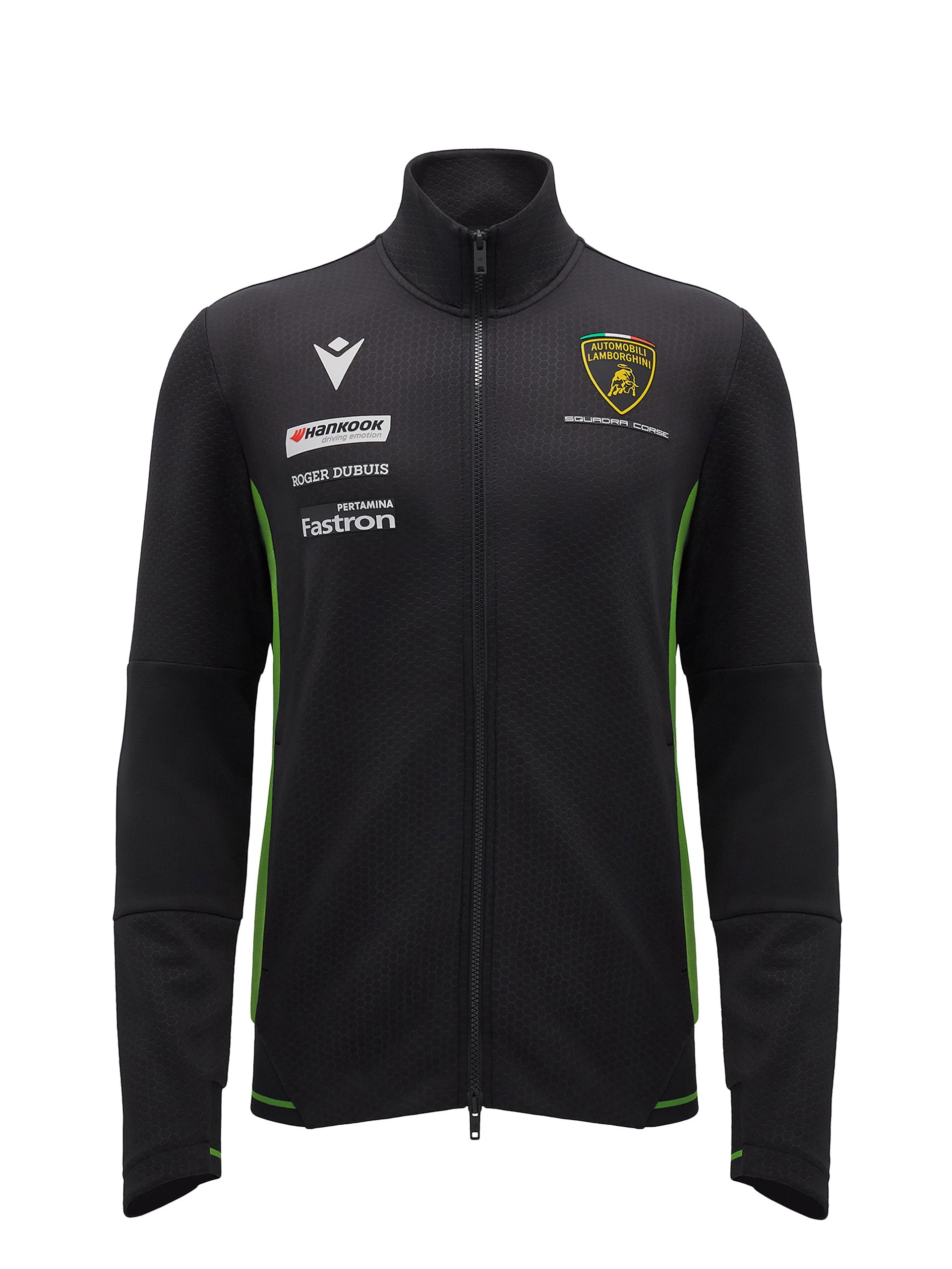 The Scuba light fabric and Jacquard workmanship offer excellent comfort to accompany you on any occasion. It features a practical central full zip and two comfortable side zip pockets. The high collar is designed to protect you from the cold. The Automobili Lamborghini Squadra Corse logo is applied on the left front. Further embellished by the colors and the official sponsors of the Racing Team.