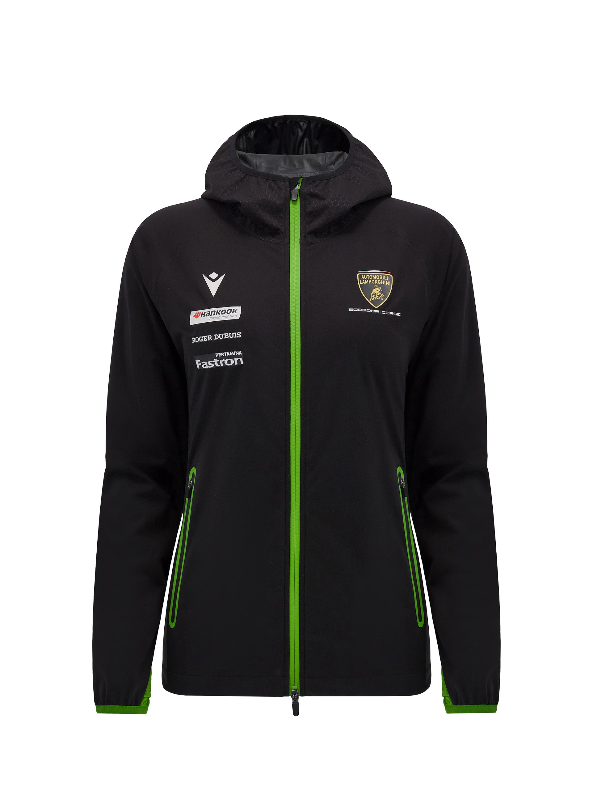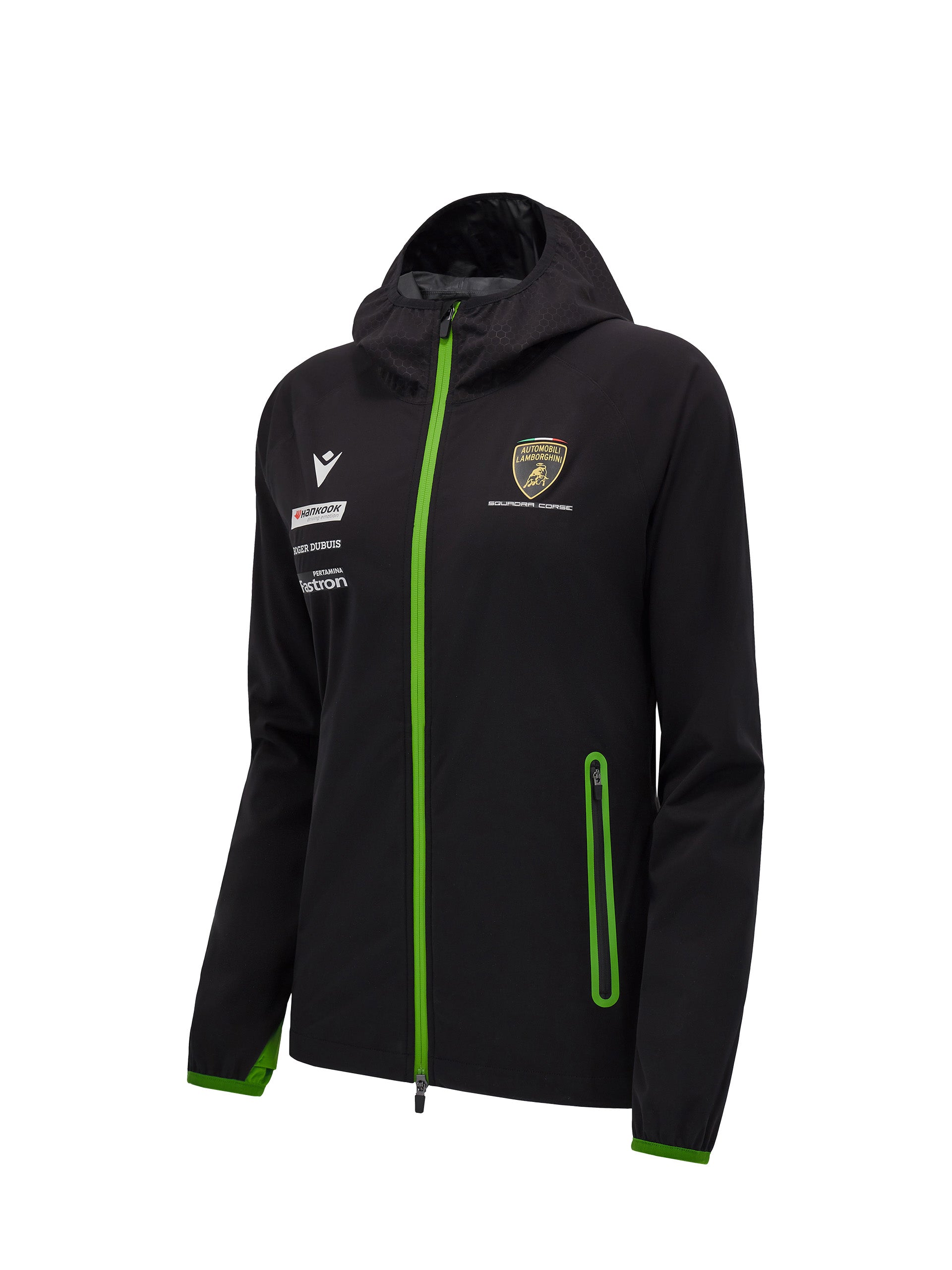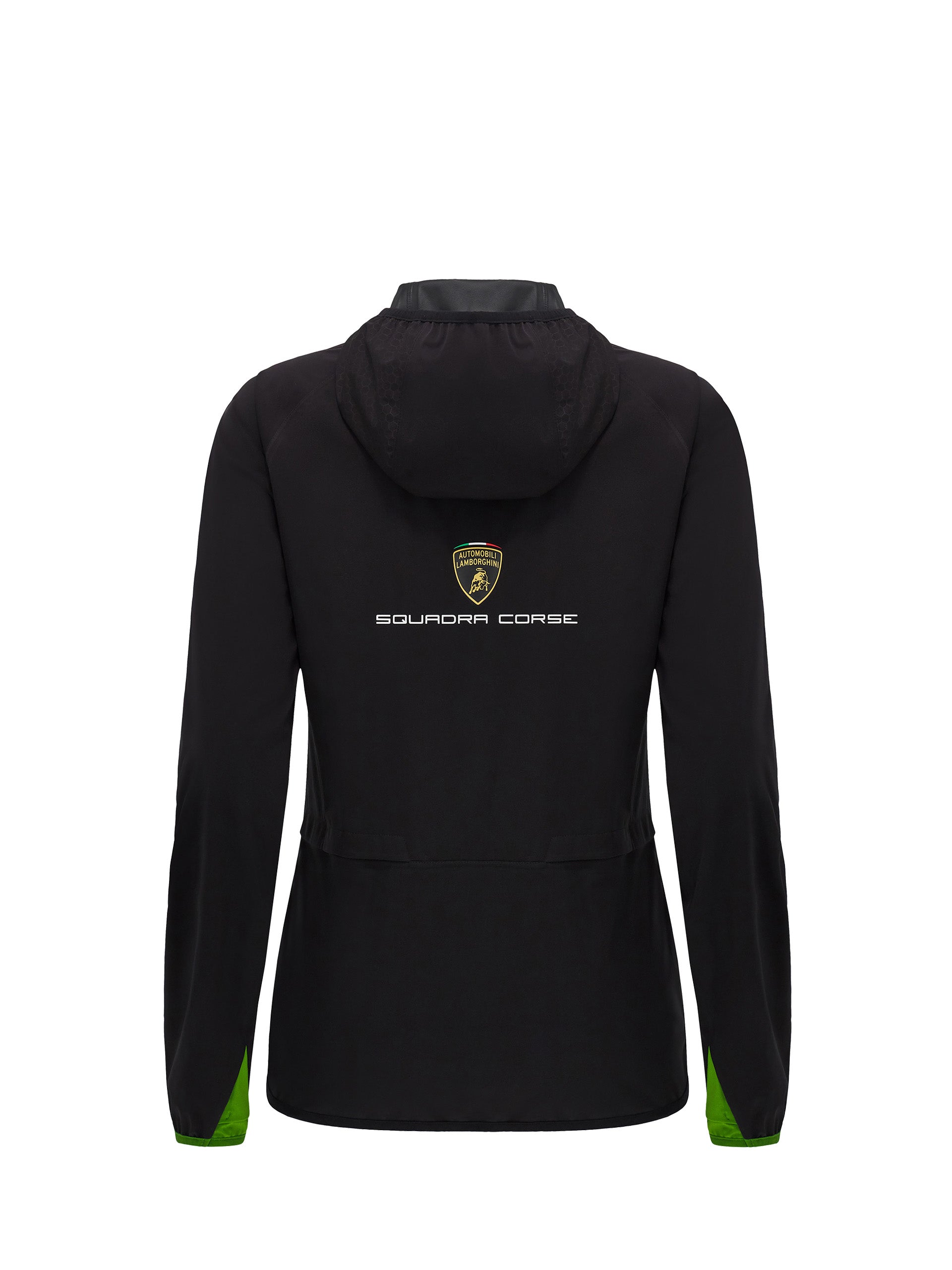 Made in lightweight, water-resistant Waterproof fabric. The hood consists of internal tape and a green lycra border. The body remains perfectly dry thanks to the internally taped seams and mesh gussets at the armpit and on the back. The Automobili Lamborghini Squadra Corse logo is applied on the left front. Further embellished by the colors and the official sponsors of the Racing Team.