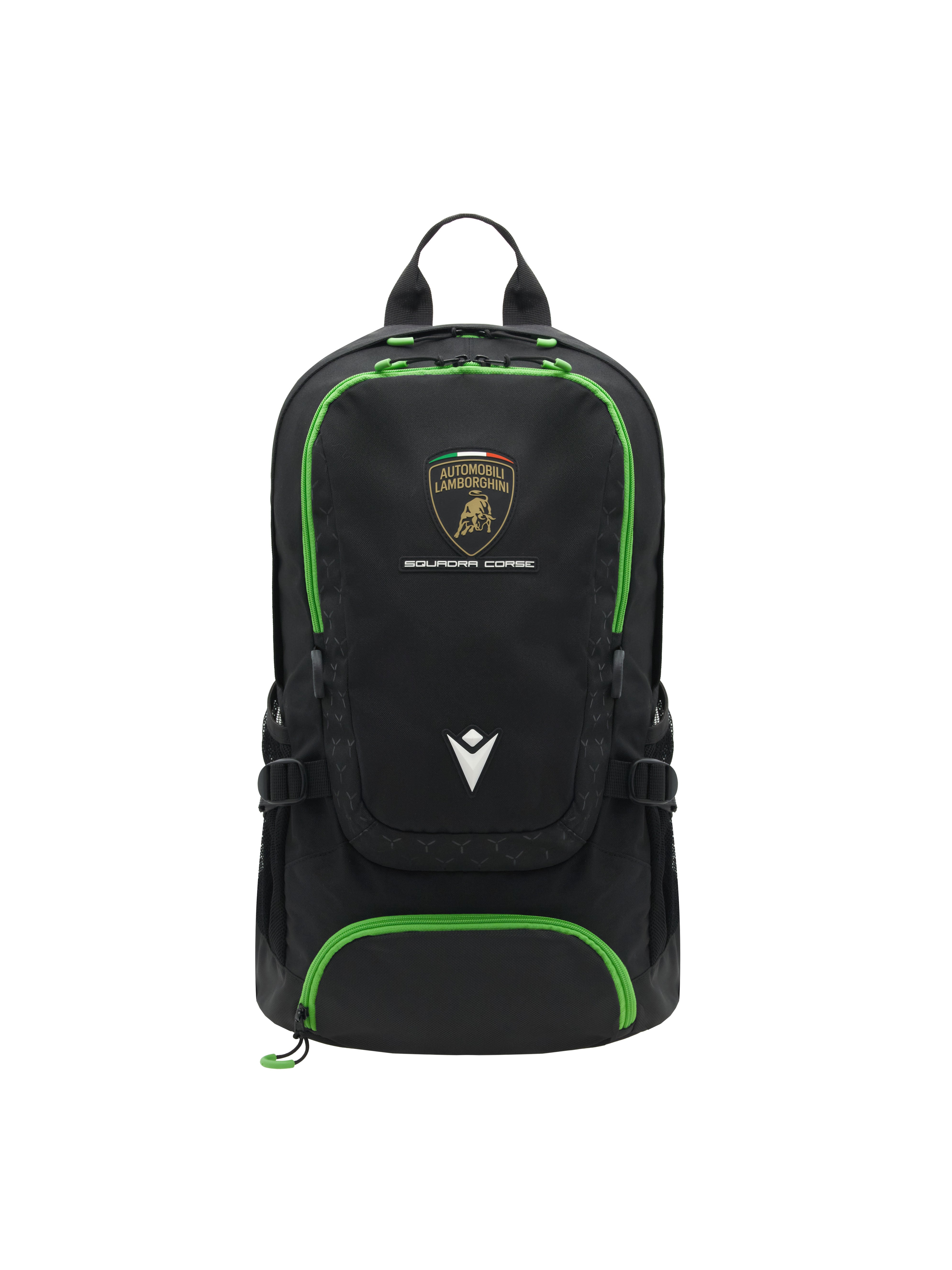 Practical and spacious, it features compartments and pockets designed to support you in every movement, offering space and organization for everything you need. The main compartment, large and functional, is closed with a zip and is ideal for carrying everyday essentials. The padded and ergonomic back panel ensures comfort during prolonged use. The front compartment includes practical organizers for orderly storage of personal items, while side pockets provide space for bottles or accessories. The adjustable padded shoulder straps in breathable mesh ensure a comfortable fit even when fully loaded. Made in the official Racing Team colours, it features the Automobili Lamborghini Squadra Corse logo applied on the front.