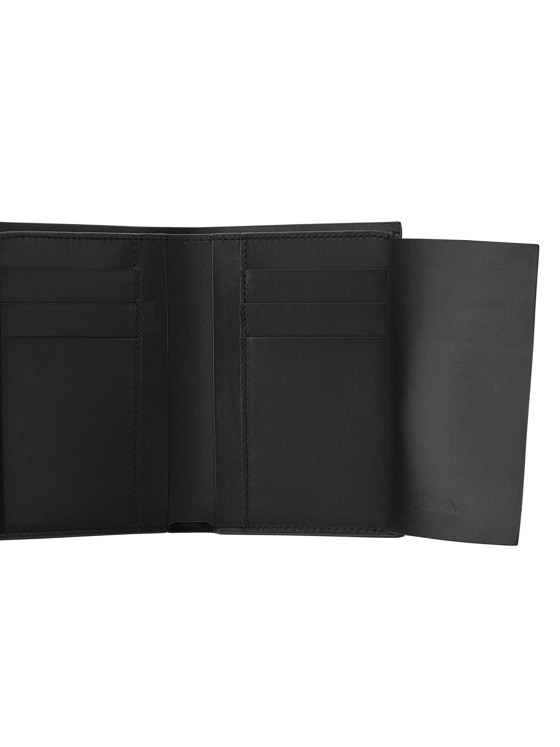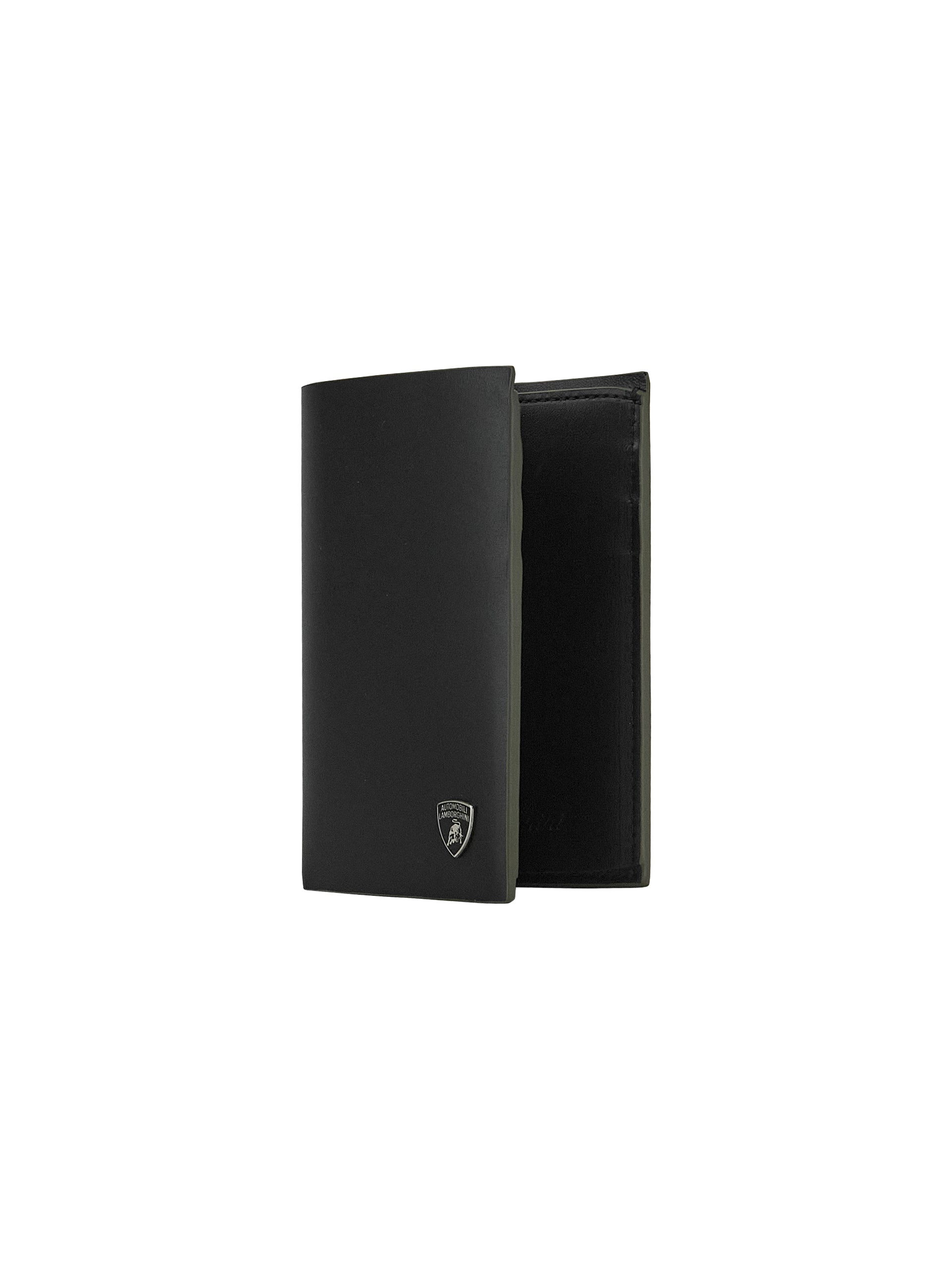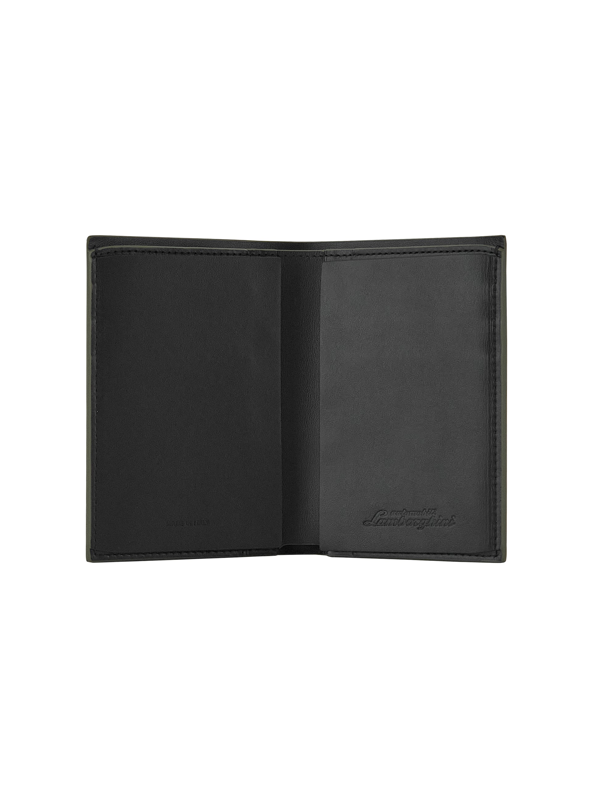 Portafoglio verticale Automobili Lamborghini caratterizzato da pellame liscio, impreziosito con l'esclusivo scudo in metallo e finiture in contrasto di colore verde militare. All'interno sei comparti porta carte, un comparto per banconote, quattro taschine extra porta carte/biglietti da visita. Dimensioni cm 9x12.5 chiuso. Composizione Calfskin Leather. Made in Italy.