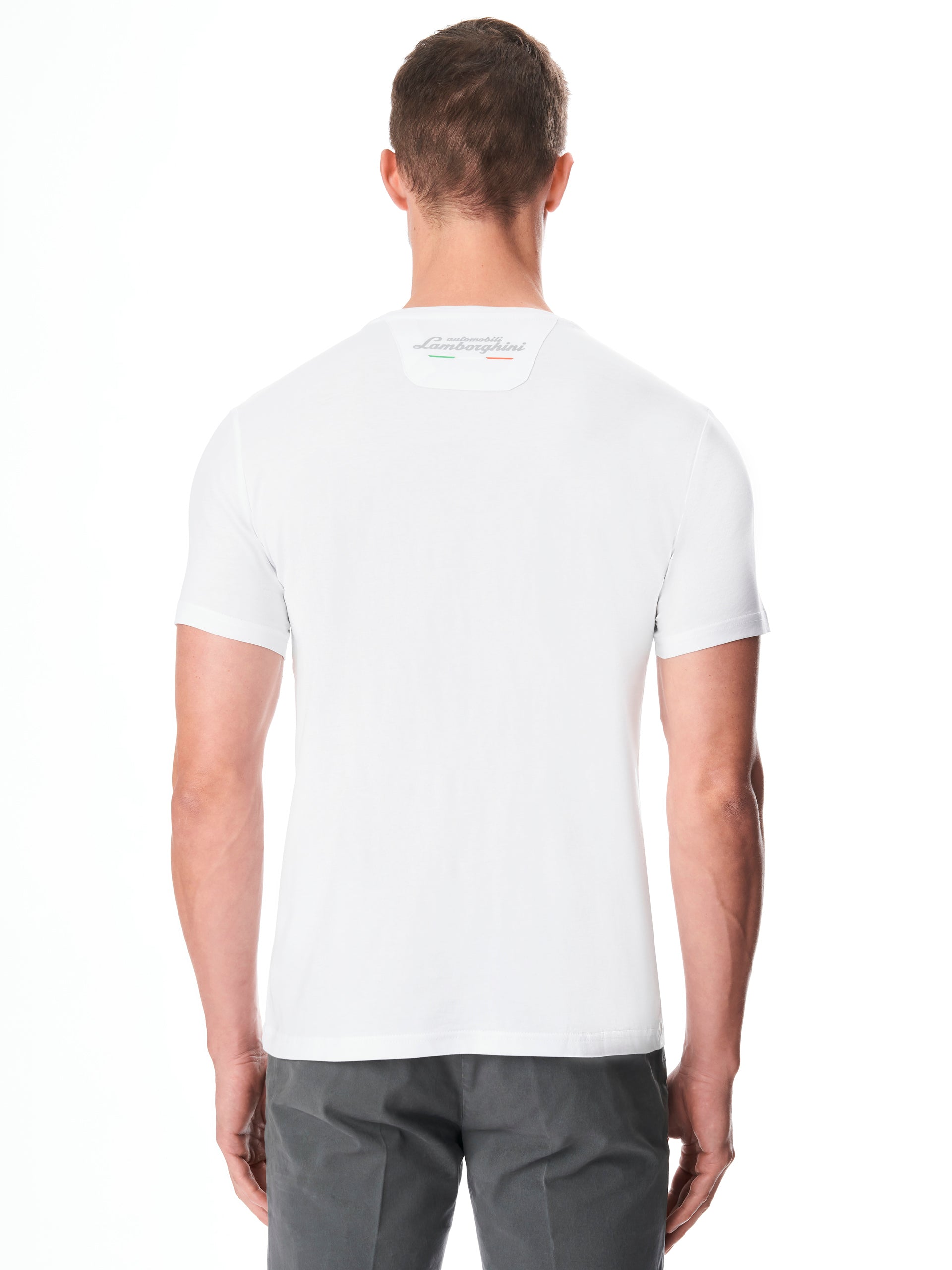 T-shirt Crew Neck Automobili Lamborghini Iconic Big Shield in Jersey di cotone. Personalizzazione con stampa scudo monocolore, stampa logoscript e dettaglio tricolore sul retro. Fit Regular. Composizione: 100% cotone.